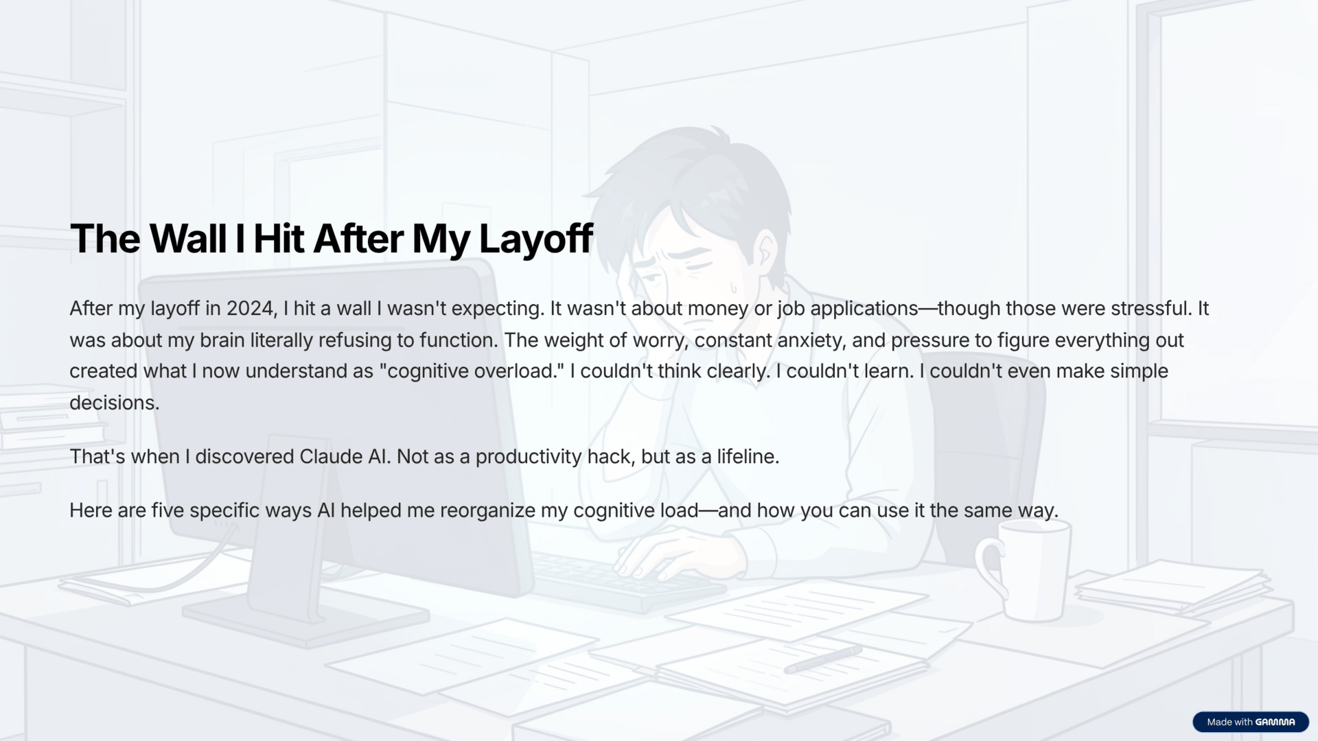 When stress breaks your brain, AI can act as external processing power. Learn 5 specific techniques for using AI to break down overwhelming questions, create structure, organize information, process emotions, and maintain continuity when you can't.